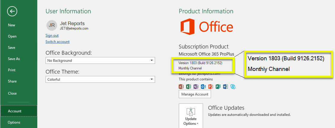 – Wenn Sie diese Richtlinieneinstellung aktivieren, sollten Sie die Richtlinieneinstellungen „Zielversion“, „Updatekanal“ oder „Updatepfad“ unter ComputerkonfigurationPoliciesAdministrative VorlagenMicrosoft Office 2016 (Maschine)Updates nicht aktivieren und konfigurieren. Wenn Sie dies tun, haben diese Richtlinieneinstellungen Vorrang. Die Option „Updatekanal“ wird weiterhin unter „Datei > Konto“ angezeigt, aber sie wird deaktiviert und der Benutzer kann keinen Updatekanal auswählen.